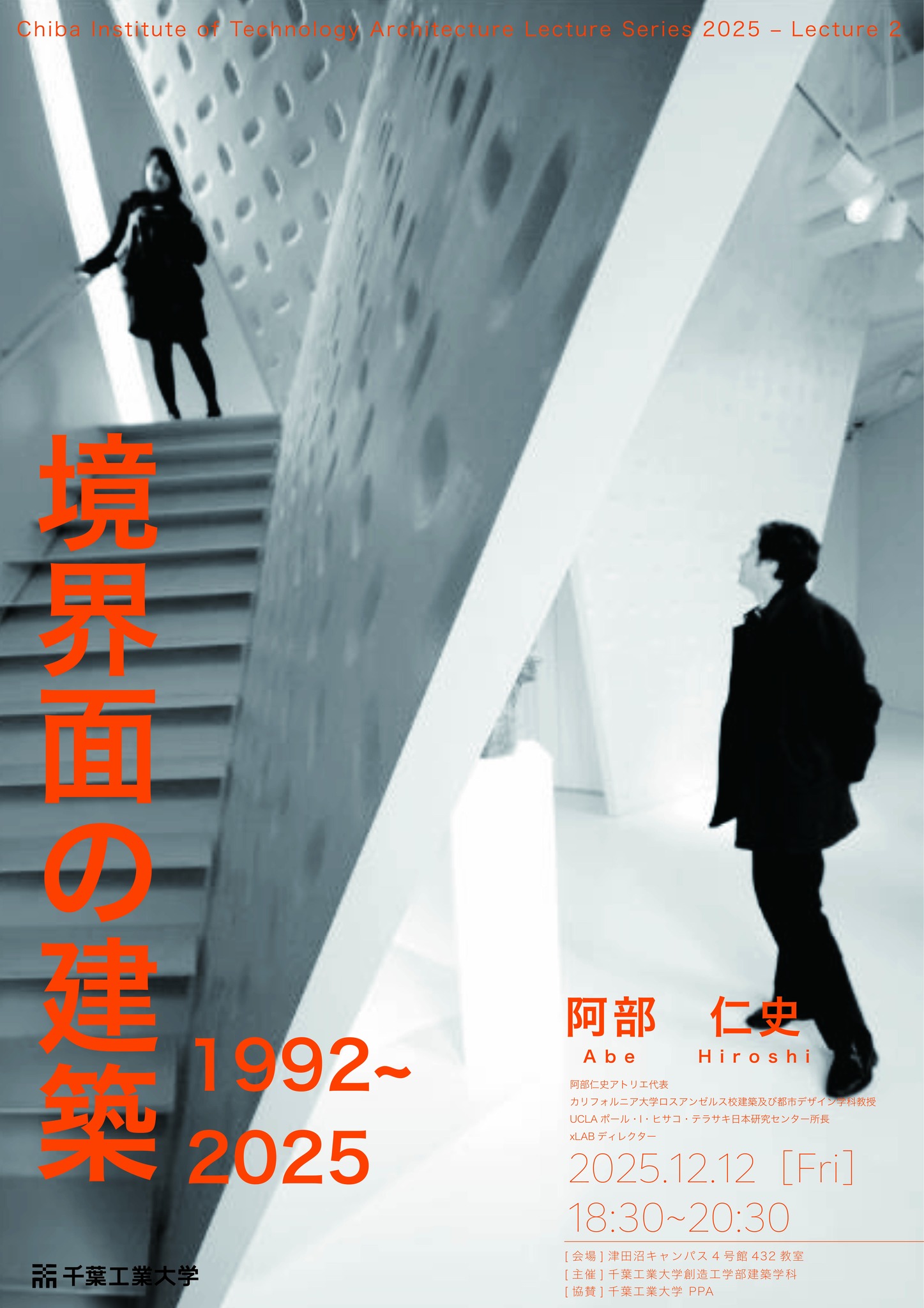 今年度の千葉工業大学 建築学科 レクチャーシリーズは、全3回の開催を予定しています。第2回目はアメリカのUCLAで教鞭を執っている建築家 阿部仁史氏をお招きします。「境界面の建築 1992〜2025」と題して手掛けてきた様々な作品について語っていただきます。