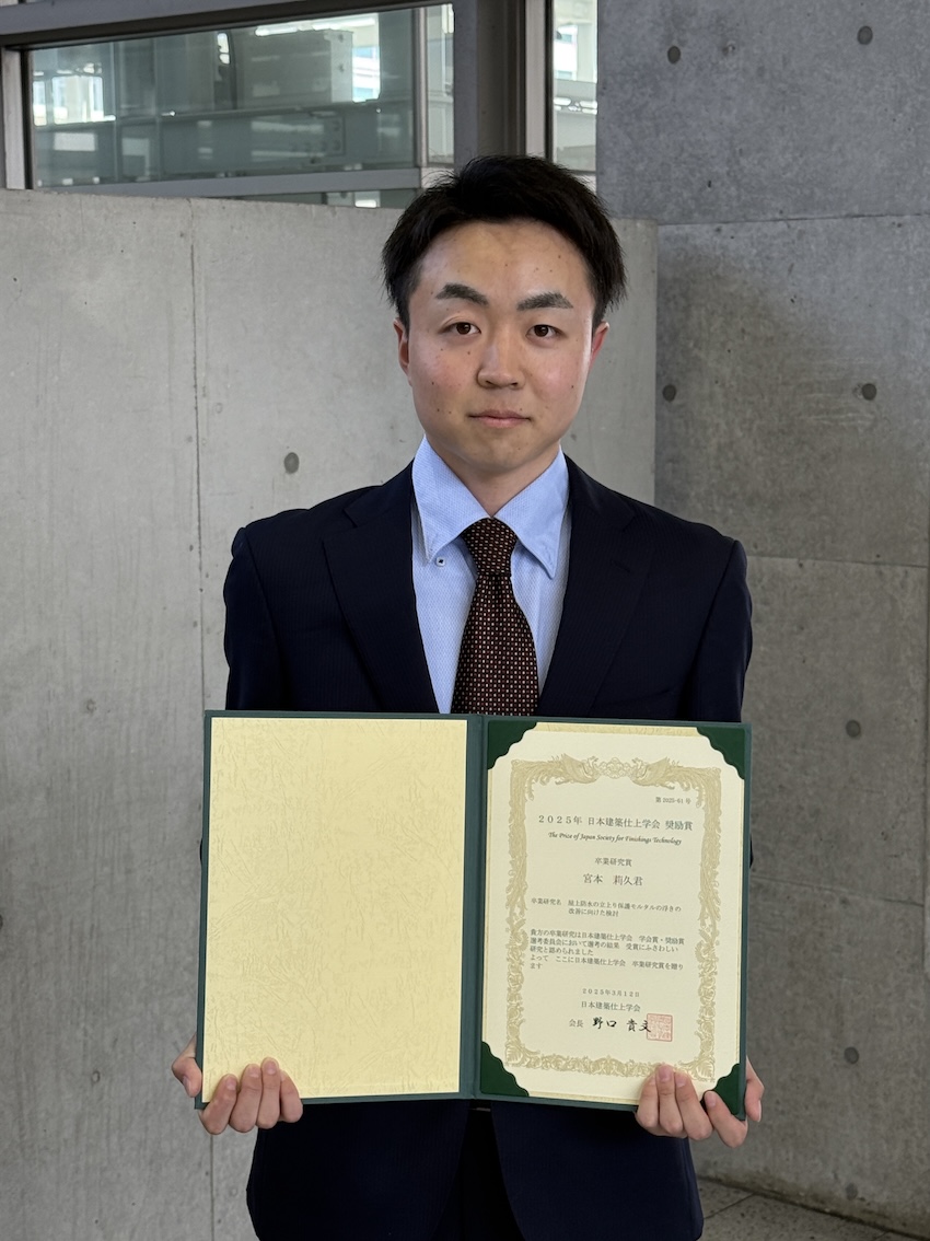 建築学科4年の宮本莉久さん(石原沙織研究室・受賞当時)が、3月12日、一般社団法人日本建築仕上学会より「奨励賞 卒業研究賞」を受賞しました。本研究のテーマは「屋上防水の立上り保護モルタルの浮きの改善に向けた検討」。 屋上の立上り部において防水層をモルタルで保護する工法では、モルタルの浮きなどの不具合が発生する事例が報告されています。これらの浮きは、モルタルが乾燥収縮により反ることが主な要因と考えられています。そこで本研究では、モルタルの乾燥収縮特性や凝結・硬化に関する基礎データを取得するとともに、実際の施工を模した試験体を用いて反り量、反りに伴う荷重、ひずみの測定を行い、浮きの抑制に向けた改善策の検討を行いました。現場での品質向上に寄与する内容として高く評価されました。宮本さんは「ご指導してくださった石原先生、苦楽を共にした研究室のメンバー、本学の工作センターの方々、日本建築学会のWGの委員の皆さまなど、たくさんの方々に支えられ、この賞を受賞することが出来ました。心より感謝申し上げます」と喜びを語っています。(news CITより)