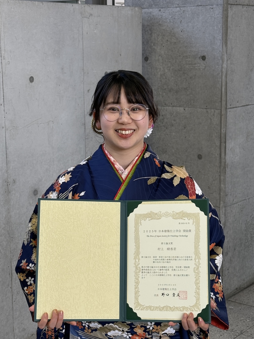 建築学専攻修士課程2年の村上晴香さん(石原沙織研究室・受賞当時)が、3月19日、一般社団法人日本建築仕上学会より「奨励賞 修士論文賞」を受賞しました。研究テーマは「接着・密着工法の屋上防水層における接着力の面的な把握と耐風性評価に向けた接着力試験の治具寸法の検討」。