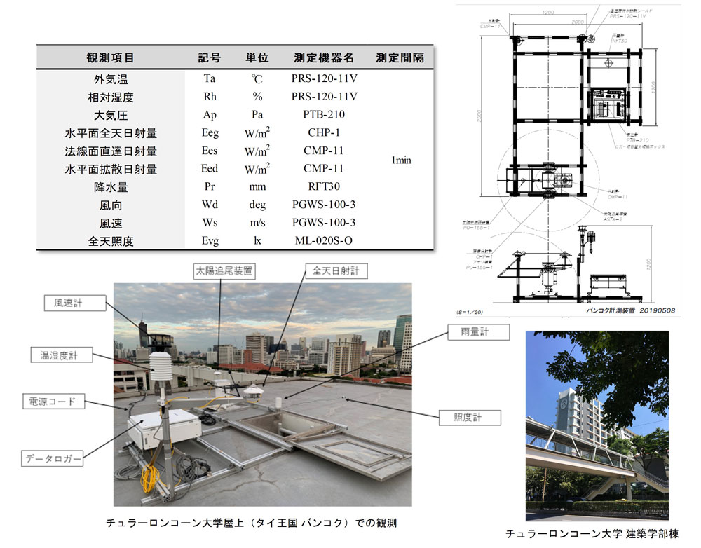 経済発展著しく、都市化の進む東南アジア都市部では大型建築物の建設が増加しています。建築設計時の環境・設備シミュレーションの入力として、現実をより反映した気象データが求められていますが、我が国の拡張アメダス気象データのような設計用データは十分には整備されていないのが現状です。そこで、東南アジアでの環境設計、設備設計に資する設計用気象データの整備を目的とし、国内外研究機関の協力のもと、独自に気象観測を行っています。