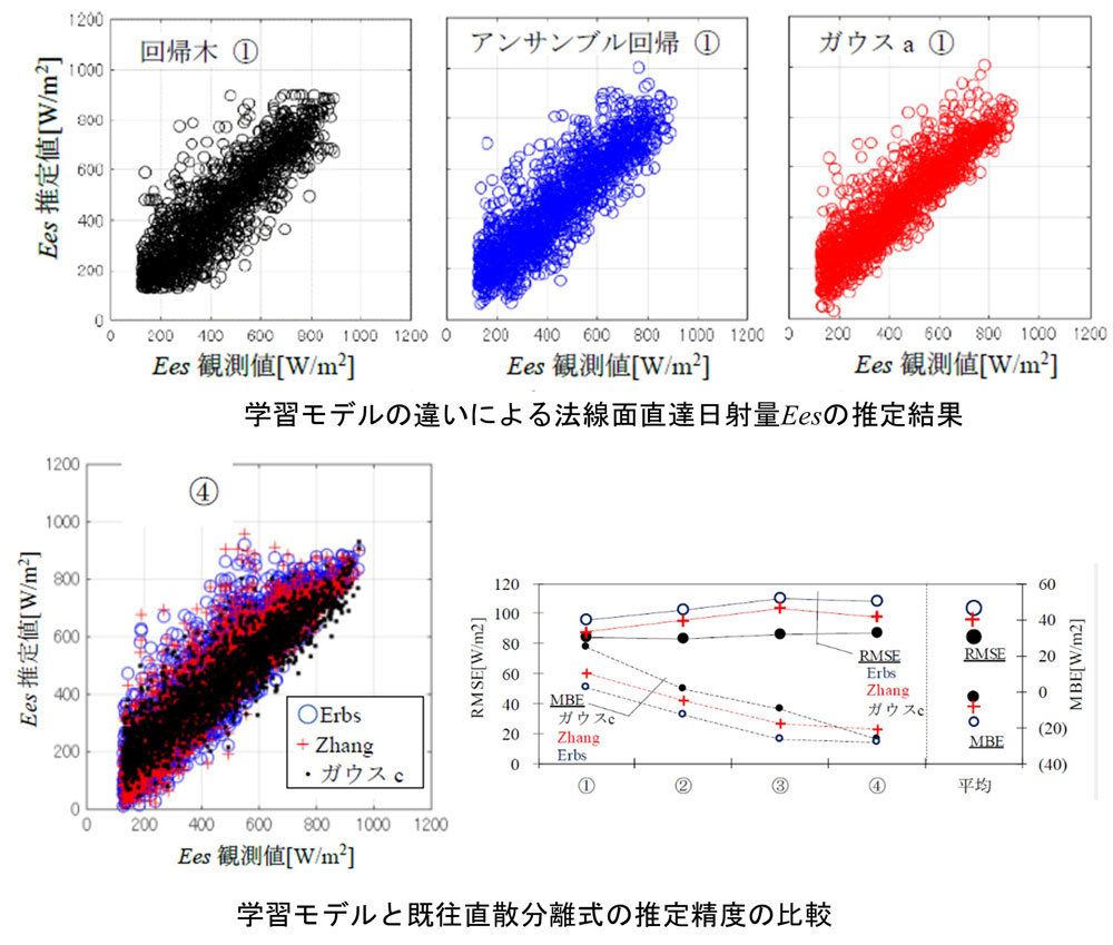 機械学習を用いて、全天日射量を直達日射量と拡散日射量に分離する直散分離手法の開発を検討しています。現在のところ、機械学習はブラックボックスモデルであり、従来の直散分離手法の様に「式」として開発・公開することはできませんが、機械学習を用いることで、既往の直散分離「式」より精度の高い推定が可能か検討する意義はあると考えています。